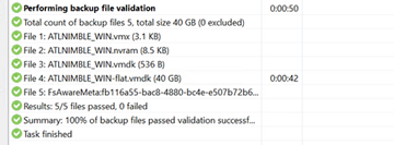 Results of the SureBackup job are in the task log of the UI and/or the emailed report. Below is a glance of the UI. We can see the AV scan took a little over 12 minutes and the CRC test was less than a minute. Not only is this helpful for compliance purposes to prove backups are tested regularly, but also for peace of mind.